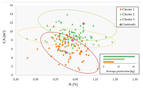 Starting from the leaves sampling, it was possible determine the crop nitrogen status. The mean nitrogen concentration of the whole plot was 0.94 % depending of the tree and influenced only by the production activity (data not show), while the vegetative characteristic wasn’t correlated with it. It was also possible to cross the different information with GIS program because yield depends on vegetative and nutritional status. Using the three groups of cluster and plotting their score of nitrogen concentration and canopy area, it was observed that the whole plot showed clear heterogeneities. These clusters were statistically different p (<0.001) in terms of productivity by ANOVA analysis (Figure 16). Moreover, the ANOVA test showed that CA has a greater effect than nitrogen concentration.