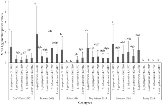 Mean (±SD) number of P. absoluta eggs on tomato genotypes in different years and seasons. Significant differences are presented for the interaction of Seasons X Genotypes. Genotypes with the same letter(s) did not differ statistically across seasons based on Tukey’s HSD (p = 0.05).