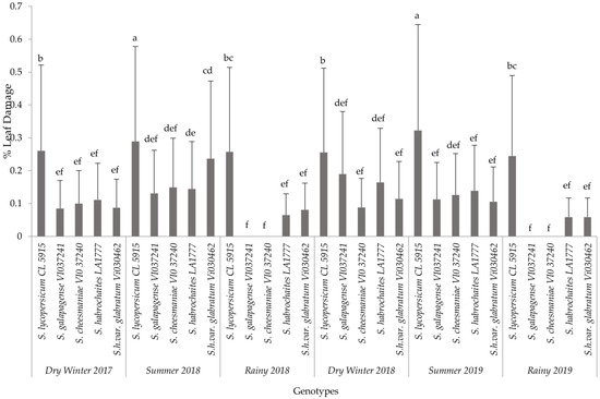 Mean (±SD) of P. absoluta foliage damage (%) on tomato genotypes in different seasons. Significant differences are presented for the interaction of Seasons X Genotypes. Genotypes with the same letter(s) did not differ statistically across seasons based on Tukey’s HSD (p = 0.05).