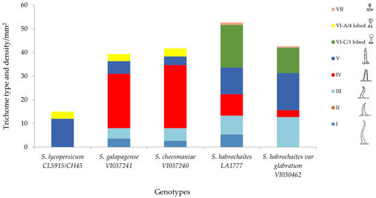 Figure 7 shows the combination of trichome types present in each accession when observed under microscope. The finding showed that type IV glandular trichome is more abundant in S. galapagense (VI037241) and S. cheesmaniae (VI037240), followed by S. habrochaites (LA1777) and S. habrochaites var. glabratum (VI030462) accessions, but it is absent in S. lycopersicum (CL5915). The density of glandular trichomes was higher in all the wild Solanum accessions, whereas nonglandular type V trichome density was comparatively higher in the susceptible genotype. In addition, type VII glandular trichomes were found only in S. habrochaites (LA1777) and S. habrochaites var. glabratum (VI030462) accessions but absent in other accessions.