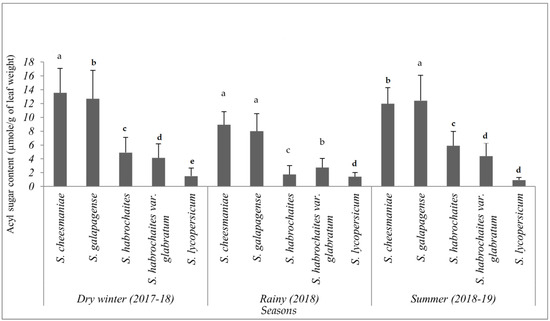 Although acylsugar content was drastically reduced during wet seasons at different phenological stages, the total acylsugar was found to be significantly higher in S. galapagense (VI037241) and S. cheesmaniae (VI037240) accessions, followed by S. habrochaites var. glabratum (VI030462) and S. habrochaites (LA1777) accessions, compared to the susceptible S. lycopersicum (CL5915) (F = 317.19, p < 0.001, df = 4) (Figure 8). Similarly, S. galapagense (VI037241) and S. cheesmaniae (VI037240) accessions recorded significantly higher acylsugars in the winter (F = 335.86, p < 0.001, df = 4) and summer (F = 308.84, p < 0.001, df = 4) seasons as well (Figure 8).