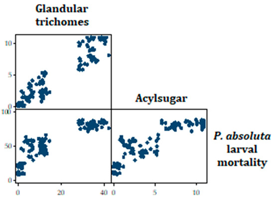 Scatterplot matrix showing the relationship between total glandular trichomes and P. absoluta larval mortality, as well as acylsugar and P. absoluta larval mortality.