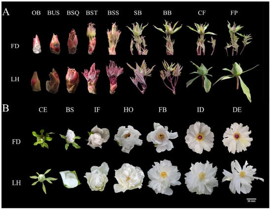 Typical features of two tree peony varieties during bud development process (A) and flower development stages (B). FD: Paeonia ostii ‘Feng dan’; LH: Paeonia suffruticosa ‘Lian he’; OB: Overwintering bud; BUS: Budding stage; BSQ: Bud-squaring stage; BST: Bud-sticking stage; BSS: Bud-standing stage; SB: Small-bell stage; BB: Big-bell stage; CP: Circular peach stage; FP: Flat peach stage; CE: Color-exposure stage; BS: Blooming stage; IF: Initial flowering stage; HO: Half opening stage; FB: Full blooming stage; ID: Initial decay stage; DE: Decay stage.