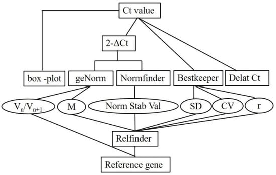 Four software default parameters, Delta Ct [40], geNorm [41], NormFinder [42], and BestKeeper [43], were used to analyze the stability of candidate reference miRNAs. The M value representing the stability of each reference miRNA was calculated by geNorm. The paired variation value (Vn/Vn+1) of candidate miRNAs was calculated using geNorm to determine the optimal number of reference genes for accurate normalization. We proposed 0.15 as a threshold value, which suggested that adding one more gene into the combination of reference genes is not required. The gene with the lowest Normfinder stability value is the most appropriate reference gene. The geometric mean of the original Ct values obtained by real-time fluorescence quantification was directly input into the Bestkeeper program to calculate the equivalence of correlation coefficient (r), standard deviation (SD), and coefficient of variation (CV). Finally, RefFinder (http://blooge.cn/RefFinder/ (accessed on 9 November 2022)) was used to conduct a comprehensive online evaluation of the obtained results of the above software. The analysis mode is shown in Figure 2.