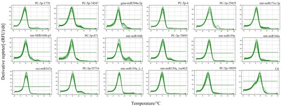 All candidate reference miRNAs were analyzed by qRT-PCR. The result showed that a single peak appeared in the dissolution curve of 18 candidate reference miRNAs, without the primer dimer (Figure 3). It indicated that the specificity of primers was good and they could be used in the qRT-PCR experiment.