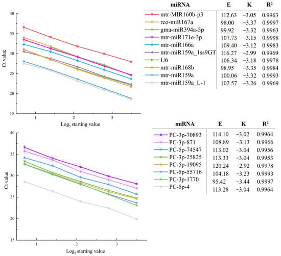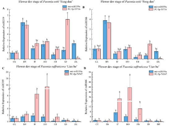 RT-qPCR technology was used to detect expression patterns of cpa-MIR319-p3_1ss20GT and mtr-miR166g-5p (CNGBdb, Accession number CNP0002984) to verify the authenticity of the selected reference miRNAs. Studies have shown that miR319 and miR166 are important regulatory factors in the plant flower development process [4,44]. Therefore, they were selected to verify the stability of selected reference miRNAs. The method of primer design was the same as that of candidate reference miRNAs, and the primers used are presented in Table 1. The relative expression of miRNAs was calculated using the 2−∆∆Ct method.