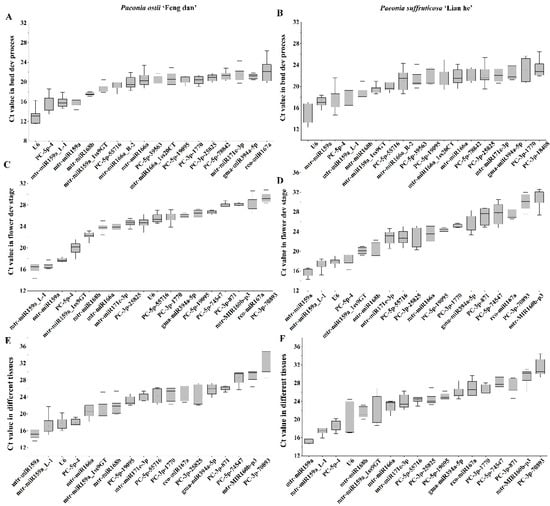 Cycle threshold (Ct) variation of candidate reference miRNAs. The box–whisker plot represents the Ct changes in buds, flower development stages, tissues of Paeonia ostii ‘Feng dan’ (A,C,E), and Paeonia suffruticosa ‘Lian he’ (B,D,F).