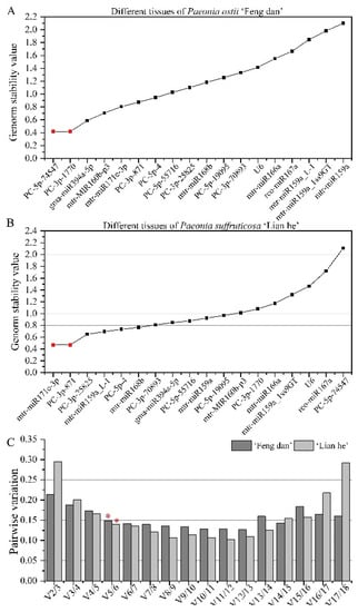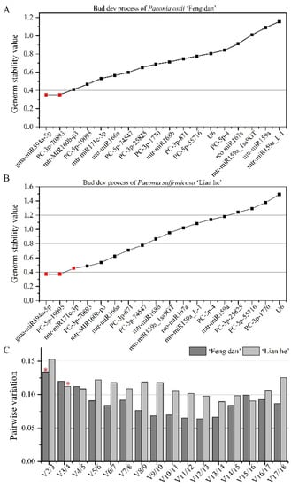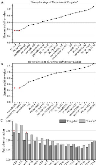 Expression stability analysis and pairwise variation (Vn/Vn+1) analysis of candidate reference miRNAs in different tissues calculated by geNorm. Expression stability results are shown in (A) (Paeonia ostii ‘Feng dan’) and (B) (Paeonia suffruticosa ‘Lian he’) of Figure 8. The most stable miRNA is shown on the left and the least stable miRNA is shown on the right. The red ‘■’ represents suitable miRNAs. The results of pairwise variation analysis are shown in (C). The red ‘*’ represents a suitable quantity.