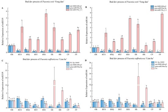 Performance evaluation of miR319 (A,C) and miR166 (B,D) expression standardization during the bud development process using reference miRNAs. OB: Overwintering bud; BUS: Budding stage; BSQ: Bud-squaring stage; BST: Bud-sticking stage; BSS: Bud-standing stage; SB: Small-bell stage; BB: Big-bell stage; CP: Circular peach stage; FP: Flat peach stage. The legend represents the internal reference used in calculating the relative expression amount. Different lowercase letters represent significant differences (p < 0.05). Error bars are standard error of mean (SEM).