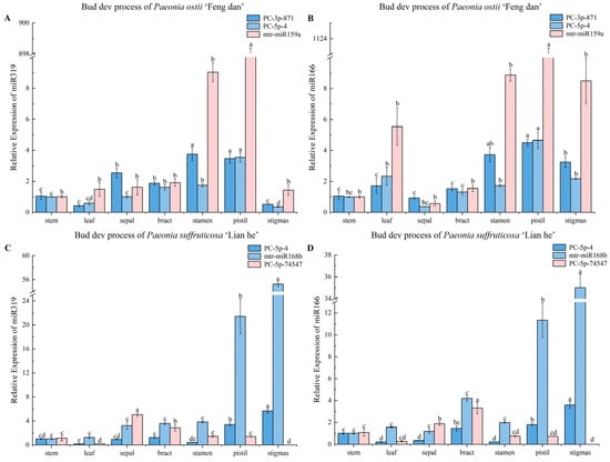 In order to further test the reliability of reference miRNAs selected from the tissue groups, PC-3p-871 and PC-5p-4 with good stability were used as an internal reference to analyze expression patterns of miR319 and miR166 in different tissues of ‘Feng dan’ tree peony. Results showed that the relative expression amount of miR319 in different tissues of ‘Feng dan’ was similar by normalization through different references, which was higher in stamen and pistil, and lowest in stigmas (Figure 11A); miR166 had the highest expression in pistil, followed by stamen and stigmas, and the lowest expression in sepal (Figure 11B). Taking the most unstable mtr-miR159a as an internal reference, its expression trend was consistent with the normalization trend of the stable internal reference. However, expression levels of miR319 and miR166 were both extremely high in the pistil, hundreds of times higher than in others, so the results were not reliable (Figure 11A,B). PC-5p-4 and mtr-miR168b of the most stable reference miRNAs and the most unstable PC-5p-74547 were selected to analyze the expression pattern of miR319 and miR166 in ‘Lian he’ tissues to verify the stability of selected reference miRNAs. With two kinds of stable miRNAs as references, the relative expression of miR319 and miR166 in different tissues changed similarly, with the highest expression and significant difference in stigmas, followed by pistil, which was also significantly higher than other tissues (Figure 11C,D). When PC-5p-74547 (unstable) was used as a reference, the highest expression of miR319 was in the sepal of ‘Lian he’, followed by the bract, and the lowest expression was found in leaves and stigmas (Figure 11C). Expression of miR166 was highest in the bract of ‘Lian he’, followed by sepal, significantly higher than those in other tissues (Figure 11D), and its trend was inconsistent with results of stable reference miRNAs analysis.