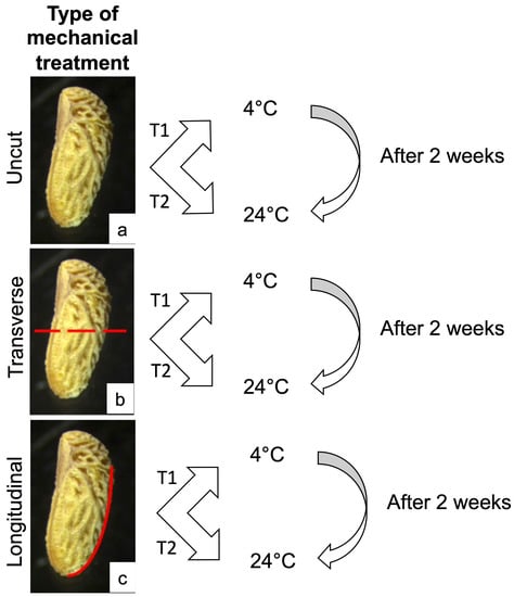 Type of mechanical and temperature treatments applied on seeds before in vitro culture: (a) uncut seed, (b) transverse cutting (halved seed), (c) longitudinal incision, stored at 4 °C for 14 days and then in vitro cultured at 24 °C (aT1, bT1, cT1), or placed directly in a growth chamber at 24 °C (aT2, bT2, cT2).
