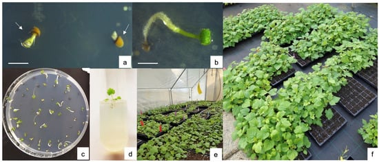 In vitro germination, rooting, and acclimatization of Polka seeds cut in half and placed directly under 24 °C (bT2) treatment. (a) The two halves of the seed at 4 days after treatment are indicated by white arrows; (b) a well-developed seedling from germinated seed after 7 days of in vitro culture (scale bar = 2 mm); (c) in vitro germination of seedlings after 10 days of in vitro culture; (d) in vitro raspberry shoot elongation and rooting; (e) gradual acclimatization of raspberry seedlings under plastic tunnel; (f) well-established in vivo plants in the greenhouse ready to be transferred to field conditions.