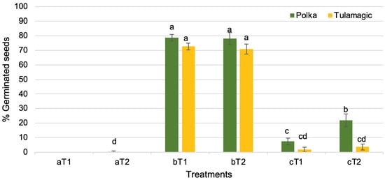 Data on in vitro germination frequency of seeds from “Polka” and “Tulamagic” open pollination exposed to different types of mechanical and temperature treatments: uncut seed (aT1), transverse cutting (bT1), and seed with longitudinal incision (cT1) stored at 4 °C for 14 days and then placed in a growth chamber at 24 °C; uncut seed (aT2), transverse cutting (bT2), and seed with longitudinal incision (cT2) placed directly at 24 °C. Results are expressed as the (number of germinated seeds/total treated seeds) ×100 at 60 days after treatment. One-way ANOVA was used to analyze the data. Different letters show significant differences at p < 0.05 by Duncan’s test (n = 125). Each value represents the mean ± standard deviation of three independent experiments.