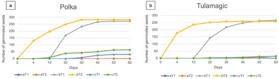 In vitro germination trend of “Polka” seeds (a) and of “Tulamagic” seeds (b) derived from open pollination, reported as the days required for seeds to germinate after the different treatments. Uncut seed (aT1), transverse cutting (bT1), and seed with longitudinal incision (cT1) stored at 4 °C for 14 days and then placed in growth chamber at 24 °C; uncut seed (aT2), transverse cutting (bT2), and seed with longitudinal incision (cT2) placed directly at 24 °C. The graphs represent the total number of germinated seeds, starting from 125 seeds, of three independent experiments (total number seeds for each condition = 375).