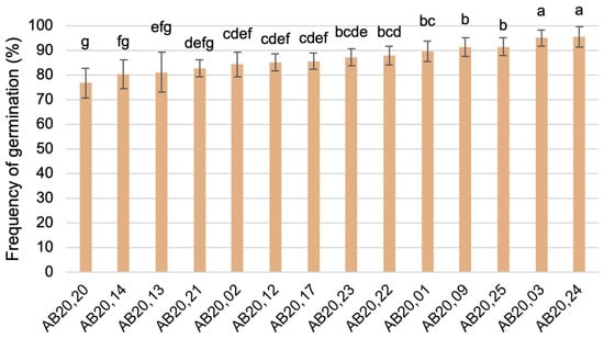 In Figure 6, all the cross combinations are reported with regards to their frequency of in vitro germination obtained by applying bT2 conditions. By applying this optimized in vitro germination protocol, the germination frequency obtained was homogeneous for all the 14 different crossings tested. The average frequency of germination was around 87%, with the highest germination rates recorded of 95.6% and 95.2% for AB20, 24 and AB20,03, respectively, and the lowest rate of 76.8% obtained for AB20,20.