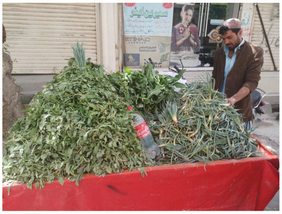 A local vendor selling WFPs (i.e., Eremurus stenophyllus, Lepidium draba subsp. chalepense, Rumex dentatus) in Quetta Bazar in Pakistan (Photo: Aziz M.A.).