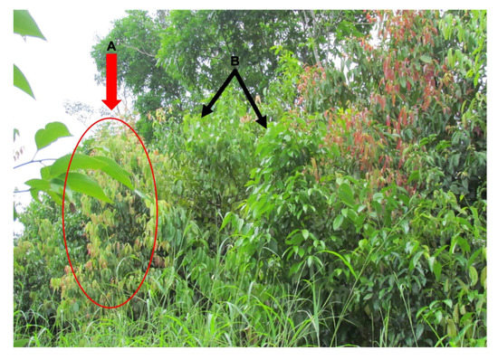 Traditional Cinnamomum verum plantations of 12 years old located in the lowland of Veracruz State, Mexico. (A) Cinnamon shrub with evident dieback, that began with chlorotic foliage and decline, and (B) healthy plants showing normal leaves.