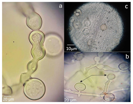 The length and width of the sporangia varied widely for each isolate, similar to the findings reported by Al-Hedaithy [37]—broadly ellipsoid to ovoid, as shown in Figure 2b (26.8 to 37.9 μm wide, and 35.3 to 66.7 μm long). Terminal spherical or globose chlamydospores of variable size (Figure 2), spherical intercalated and terminal (Figure 2b) with thick walls of 24.3 to 44.6 μm in diameter were identified, which agrees with taxonomic keys proposed by Erwin and Waterhouse [26,38] for the Cinnamomi species.