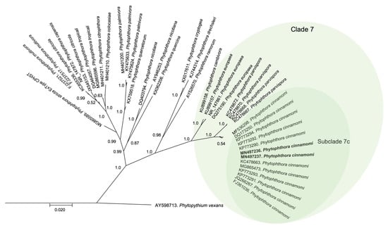A sophisticated phylogeny based on the sequences of seven nuclear genetic markers including ITS divided 82 Phytophthora species into 10 phylogenetically well-supported clades [18,43]. The results of the phylogenetic reconstruction performed in this study using sequences belonging to the ITS region identified the isolates analyzed here as P. cinnamomi, a member of Phytophthora subclade 7c; they were very well differentiated from P. parvispora, which was previously considered a subspecies of P. cinnamomi.