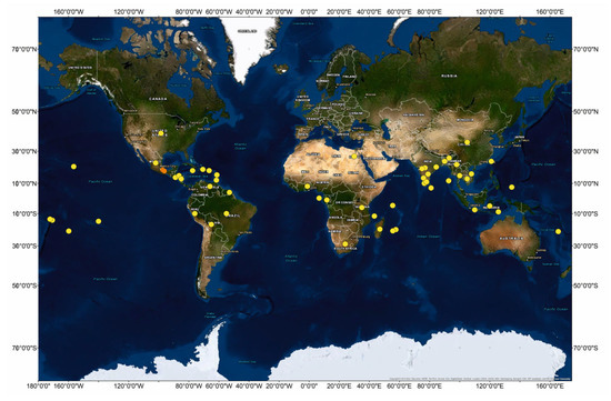 The first evidence of this fact was given by Rands [42], who described the oomycete Phytophthora cinnamomi as the causal agent of the stripe cankers on cinnamon plantations from Sumatra, Indonesia [38]. It has since been reported in an ample host range over 5000 plant species in 319 genera [11]. The spread of P. cinnamomi primarily found in the southern hemisphere has been considered as indigenous in tropical and subtropical areas, and it is currently found in 56 countries around the world (Figure 5).