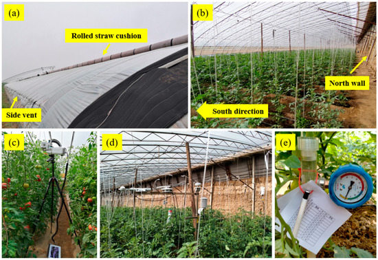 Combined photos of the sunken solar greenhouse and sensors’ deployment. (a) Outside view of the greenhouse in winter, with front plastic cover facing south and the rolled straw cushion placing on the top of the roof, (b) Inside view with tomato growth, (c) Photosynthetic parameters measurement by the LI-6800 portable photosynthesis system, (d) A view of the meteorological station inside the greenhouse, (e) Soil matric potential measurement using a dial-type tensiometer.