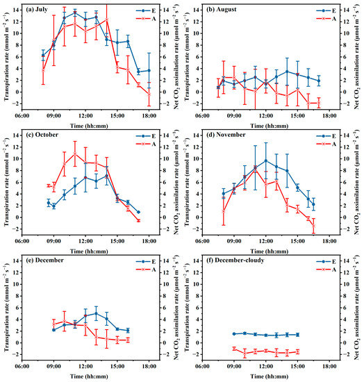 Daily courses of transpiration and photosynthesis rates in July (a), October (c), November (d) and December (e) for healthy plants on sunny days, in August (b) for diseased plants on sunny days and in cloudy days with healthy plants (f).