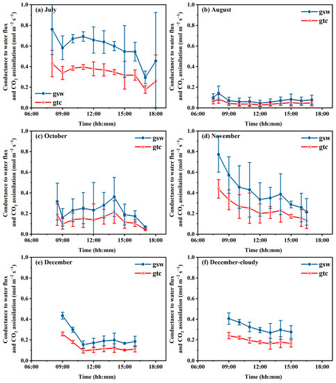 Both gsw and gtc varied greatly with seasons and plant conditions. The highest gsw and gtc were found in July, then in October and November, and the smallest in December. Diseased plants in August showed the least gsw and gtc, and were approximately 10% of that for healthy plants under similar climatic conditions (Figure 4a,b). On a cloudy day in December, the gsw and gtc values were close to that on sunny days for healthy plants.