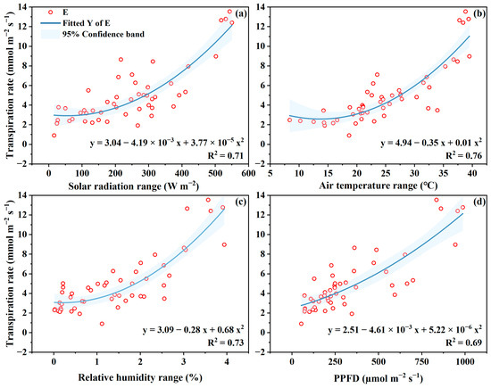 In this study, the instantaneously measured E at the leaf level was positively related to radiation, air temperature, VPD, and the light intensity on leaf surface (Figure 5). The E rate at leaf level to radiation, temperature, VPD, and light intensity can be better fitted using polynomial expressions with determination coefficient R2 of 0.69–0.75. These regression expressions show that leaf E was greatly influenced by the four microclimate variables. Considering the small wind speed in GH (0.1–0.3 m s−1) (Suppl. Figure S1e), leaf E was not significantly related to inside wind speed. The findings regarding the E and microclimate in this study are in agreement with the reports in the literatures [34,42,43,44,45]. Because of the closed environment in greenhouse, plant transpiration is decoupled to the environment [30,34,46]. In this case, transpiration is more closely related to inside incoming energy, i.e., the solar radiation. For example, Yang, Liu, Cohen, and Gao [34] measured the plant transpiration of tomato using the sap flow method and found plant transpiration was first linearly related to solar radiation in GH, followed by VPD, and temperature. Similar results are reported in greenhouse crops [47,48]. In a greenhouse in Israel, Liu, Cohen, Hugo, Yair and Josef [46] also reported that the banana sap flow was linearly related to radiation, temperature and vapor pressure deficit.