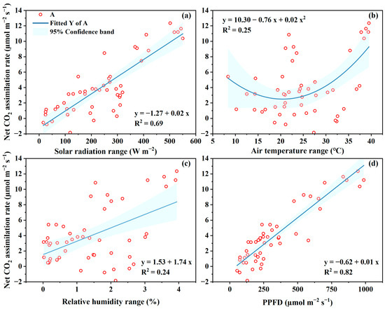 Photosynthesis rate can be used to evaluate the accumulated CO2 assimilation product, which is the base to the plant growth and fruit production. Generally, Pn rate is positively related to the incoming radiation or light intensity reaching to leaf surface [42]. An, et al. [49] further reported that the Pn is highly related to net radiation and relative humidity with determination coefficients of 0.94 and 0.77.