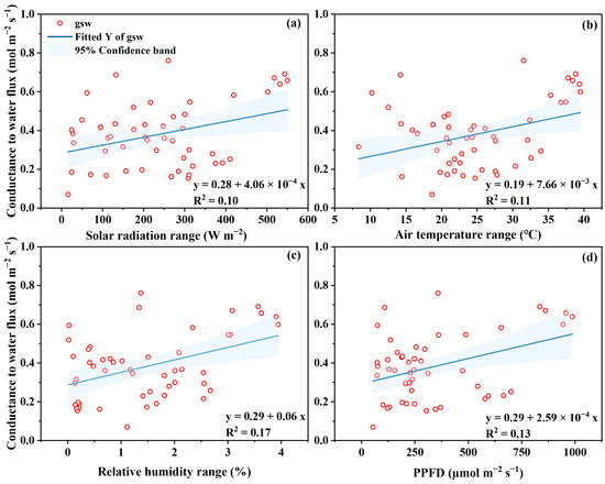 The water and CO2 assimilation flux are proportion to stomatal conductance and the gradient of water and CO2 concentrations from leaf to the environment [50,51]. The slight change patterns of gsw and gtc during daytime (Figure 4) show that the stomatal factor plays a minor role in regulating E and Pn. Then microclimatic condition could be a key factor influencing Pn and E and finally WUEL. Generally, higher VPD results in a higher transpiration rate. Whereas, high VPD just slightly influenced the conductance to CO2 flux and finally the photosynthesis rate (Figure 6c and Figure 7c). As a comprehensive result, the WUEL will be low under high VPD conditions. This conclusion is proved by the data in this study. Based on the data in Figure 8c,d, WUEL was positively related to relative humidity, and the highest WUEL was found when RH was higher than 80%. Meanwhile, the WUEL was higher when VPD was smaller than 2 kPa, then decreased by approximately 50% at 2–3 kPa (Figure 8c,d). Therefore, maintaining high RH (>80%) and low VPD (<2 kPa) could improve the water use efficiency at the leaf level, which finally will enhance the water use efficiency at the field scale.