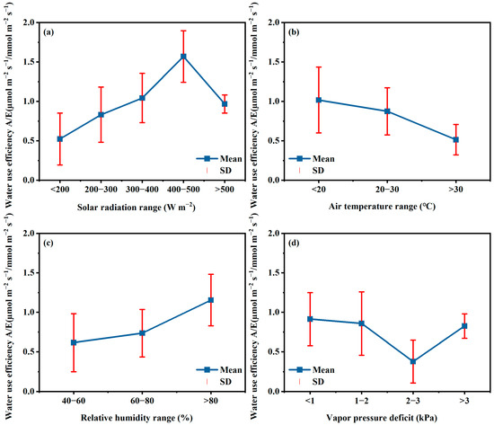 The relationships between water use efficiency at leaf level to solar radiation (a), air temperature (b), relative humidity (c), and vapor pressure deficit (d).