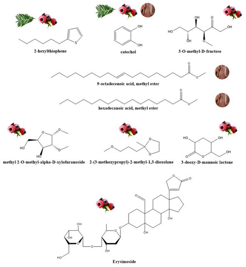 Main phytochemicals identified in Taxus baccata extracts by GC–MS. Pictograms indicate the organ of the plant in whose extract the compound is present.