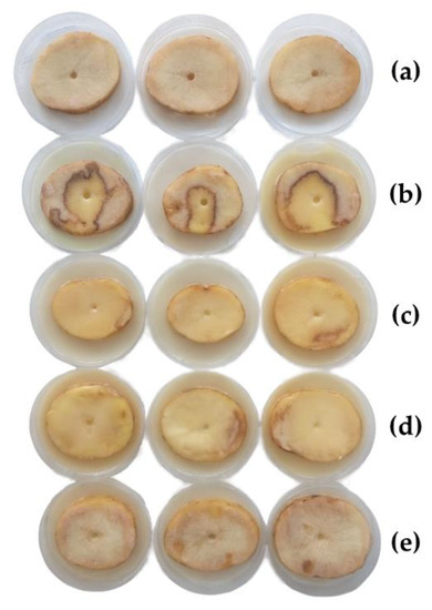 Ex situ inhibitory activity of aqueous ammonia leaf extract of T. baccata against Pectobacterium carotovorum subsp. carotovorum strain CITA Ecc-8 artificially inoculated on potato tuber slices: (a) negative control (sterile water); (b) positive control (pathogen and no treatment); (c) simultaneous inoculation of the pathogen and application of the extract; (d) inoculation of the pathogen and subsequent application of the extract after 2 h; and (e) application of the extract and subsequent inoculation of the pathogen after 2 h.