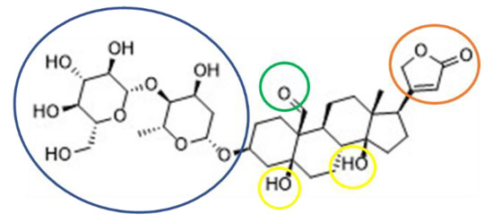 Functional groups in erysimoside: hydroxyl at 5 and 14 (in yellow); oxo at 19 (in green); β-d-glucopyranosyl-(1->4)-2,6-dideoxy-4-O-β-d-ribo-hexopyranosyl at 3 (in blue); and furanonyl (butenolide ring) at 20 (in orange).