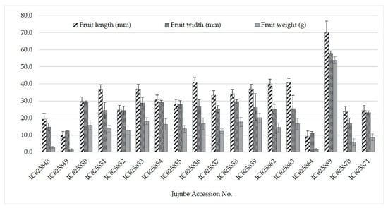 The mean values of fruit physical traits presented in Figure 1 shows a wide variation among 18 jujube genotypes for fruit length, width and weight. Fruit length and width differed by 7.61 and 5.17-fold and varied from 9.02–70.05 (mm) and 11.2–57.9 (mm) with a mean value of 31.7 mm and 25.5 mm, respectively. The fruit weight (g) differed by 38.4-fold and varied from 1.4 to 53.8 with the mean value of 14.6 (Figure 1). The jujube genotype, IC 625869 (Z. mauritiana) had distinctly higher values for fruit-length, -width and -weight than rest of the other genotypes. In contrast, genotype IC 625864 (Z. oenoplia) noted with lowest fruit-weight and -size (length and width), that was close to Z. mauritiana (IC 625849) and Z. rotundifolia (IC 625848) accessions. The variations in fruit physical traits in the accessions within the jujube species have been adequately reported in the studies from arid as well as other regions [,], but variations at species levels are scarcely available particularly from Indian hot-arid regions. Considering the fact that the distinctive phenotypic traits of fruits in the germplasms are controlled primarily by four major QTLs (genetic maternal) like globe, sun, ovate, and fs8.1. The globe, had a greater unique effect on fruit length than fruit width, and this is likely the primary factor driving changes in fruit size [,]. Thus, jujube fruit length may be shorter than width, depending on fruit shape, which can range from obovate/round/oval to oblong.