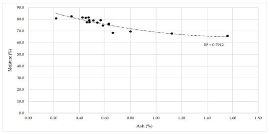 The mean values reported in Figure 2 showed a wide variation in percent fruit ash and fruit moisture contents in 18 jujube accessions, indicating diversity in inorganic and organic compounds present in their fruits. The highest ash content (%) differed by 7.09-fold and varied from 0.22 to 1.56% with the mean value of 0.61%. The genotypes IC 625849, IC 625848 and IC 625871 contained higher fruit ash, while IC 625870, IC 625850, IC 625851 and IC 625854 genotypes had lower contents. The values for the fruit moisture content (%) and ash content (%) presented in bar diagrams in Figure 3 showed inverse trend with each other. Previous reports state that the moisture content in food is concerned with the amount of water present; and ash content in food can be an inorganic residue remaining after either ignition or complete oxidation of organic matter, and rich in specific inorganic minerals [,]. Therefore, the fruit with higher ash contents in our study might also have higher level of mineral contents besides having some important organic compounds. However, since different foods have different compositions, so a direct relationship may not be expected but, within one type of food, the higher the dry matter, the higher the ash such as in jujube. Hence, it can be inferred that the higher the fruit moisture content, the lower the fruit dry matter content (ash), or vice -versa, this relationship has been reported by several researchers [,,,,,,,,,,,,,,,,,,,,,,,,,,,,]. Furthermore, the presence of free moisture is directly related to water activity; and an important indicator of shelf life [,,]; while the ash content is reportedly linked to a food’s nutrition and longevity [,,]. Hence, the moisture and ash content are important determinants of aesthetics and nutritional values of fruits.