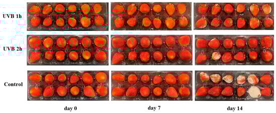 Effect of preharvest UV-B treatment on fruit appearance and shelf life. Red fruits were harvested from plants treated with different durations of UV-B (0.7362 J/s m2) treatment and control (no treatment). Fruits were stored at 5 °C and 75% relative humidity. Photos were taken on day 0 (harvest day) and days 7 and 14 after harvest.