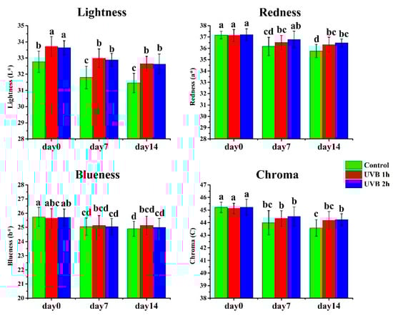 Both UV-B 1 h and UV-B 2 h treated plants exhibited similar growth to control (no treatment). Ripe fruits (red stage) were collected and used for all analyses. The individual fruit weight ranged from 12 to 14 g, and the average single fruit weight for UV-B 1 h, UV-B 2 h and control were 12.9, 13.0 and 12.9 g, respectively. As shown in Figure 1, there were no clear differences in fruit size between UV-B treatments and control, either. As for fruit appearance, at day 0 (harvest day), there were no significant differences in fruit redness (a*), blueness (b*) and chroma (C) (Figure 1 and Figure 2). However, the lightness (L*) value of UV-B-treated fruits was significantly higher than the no treatment control, suggesting that the UV-B-treated fruits maintained a fresher appearance, as darkening/dulling is an indication of senescence in strawberry fruits.