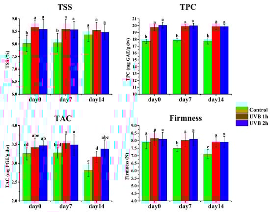 The total soluble solids (TSS), total phenolic content (TPC) and total anthocyanin content (TAC) in UV-B-treated fruits were significantly higher than in untreated fruits on harvest day (day 0) (Figure 3). However, there were no significant differences in fruit firmness between UV-B-treated and untreated fruits on harvest day (day 0).