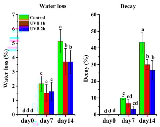 In addition, we observed the occurrence of fruit decay (mainly Botrytis) in control fruit on day 5, with a decay ratio of 10% on day 7, reaching 43.3% on day 14 (Figure 1 and Figure 4). In contrast, the UV-B-treated fruits, especially those treated with 2 h UV-B daily, exhibited a lower decay ratio than the controls. On day 7, one- and two-hour UV-B-treated fruits had decay ratios of 7% and 3%, respectively. On day 14, the decay ratio for one- and two-hour UV-B-treated fruits were 33% and 25%. These results indicate that preharvest UV-B treatments can dramatically reduce fruit decay incidence during storage and extend shelf life.