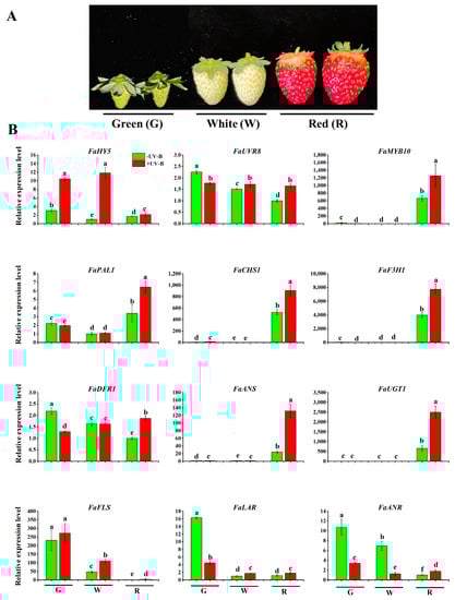 To investigate how fruits respond to UV-B treatments during fruit development, we treated fruits at green, white and red stages with UV-B and examined the expression changes in the genes involved in the UV-B pathway. As shown in Figure 5, the expression of the FaHY5 gene was significantly induced by the UV-B treatment in green- and white-stage berries, while the expression level in red berries was the lowest, and had no obvious response to UV-B treatment. We also examined the expression pattern of FaUVR8. In all berry stages, FaUVR8 was constitutively expressed and showed no response to UV-B treatment. The results were consistent with previous findings in grape, tomato and Arabidopsis showing that UVR8 does not respond to UV-B and FaHY5 shows a significant UV-B regulation [5,19,27].