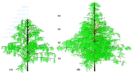 Snapshots of 3D reconstruction of one ‘E083’ irrigated plant in the (A) 1st (2012) and (B) 2nd (2013) harvest year, illustrating the strata along plant canopy: S1: 20–60 cm (or <60 cm); S2: 61–100 cm; S3: 101–140 cm; S4 > 140 cm.
