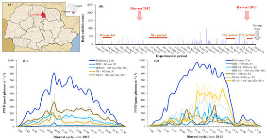 Experimental site localization and the environmental factors during experiment. (A) Londrina localization is tagged in red at Northwest of Paraná state, Brazil; (B) Daily rainfalls during the experimental period, periods of 2012 and 2013 harvests, dry periods, and the strong frost that ended the experiment are tagged. Photosynthetic photon flux density (PPFD, μmol photons m−2 s−1), values (means ± standard errors, n = 4), registered along the plant canopy strata and in the reference (2 m above soil) in (C) June 2012, and (D) June 2013.