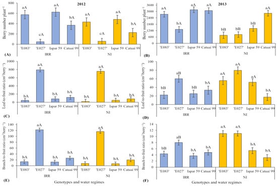 Reproductive and vegetative investments at plant scale: (A) Berry number in 2012 and (B) 2013; Leaf-to-fruit ratio (cm2 berry−1) in (C) 2012 and (D) 2013; Branch-to-fruit ratio (cm2 berry−1) in (E) 2012 and (F) 2013) of four genotypes of Coffea arabica cultivated under two water regimes (irrigated-IRR; not irrigated-NI). Mean values ± standard errors (n = 4) are shown. Lower-case letters compare genotype effects within each water regime; upper-case letters compare water regime effects within each genotype, always separately for each harvest year.