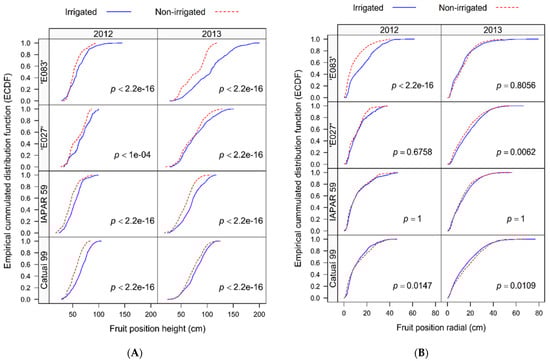 Empirical cumulative distribution function (ECDF) for berries along the (A) height of the canopy and (B) radial plant profile analyzed for four genotypes of Coffea arabica cultivated under two water regimes (irrigated and not irrigated). The p-values are shown (n = 4), comparing water regimes, separately for each genotype and harvest year (2012 and 2013).