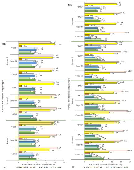 Chemical contents (% of dry matter) of coffee grains: PRO (proteins), LIP (lipids), CAF (caffeine), SUC (sucrose), TS (total soluble sugars), CGA (total chlorogenic acids), PC (phenolic compounds) of two harvests, (A) 2012 and (B) 2013, analyzed in four genotypes of Coffea arabica among the plant canopy strata (S1: 20–60 cm; S2: 61–100 cm; S3: 101–140 cm; S4: >140 cm). Estimated means ± standard error (n = 2–4) are shown. Lower-case letters compare genotype effects in each stratum, whilst the upper-case letters compare stratum effects in each genotype.