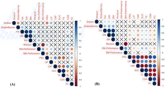 Graphical presentation of coefficients (values corresponding to circle size and color intensities) and p-values < 0.05 (not crossed circles) for general correlations among berry distribution along plant canopy strata (Stratum (S1–S4), StratumBerries (number of berries stratum−1)), yield [FM and DM (fresh and dry berry mass stratum−1 respectively), BM (processed bean mass stratum−1), initial berry moisture, DM and BM performances, and chemical parameters (PRO (proteins), LIP (lipids), CAF (caffeine), SUC (sucrose), TS (total soluble sugars), CGA (total chlorogenic acids), PC (phenolic compounds)) of four Coffea arabica genotypes in (A) 2012, and (B) 2013.