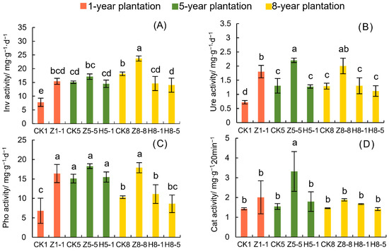 Soil enzyme activity under different years of growing and replanting. Note: Sample nomenclature is the same as that of Table 2. (A): Inv activities; (B): Ure activities; (C): Pho activities; (D): Cat activities. Different lowercase letters indicate a significant difference at p < 0.05.