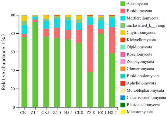 The fungal isolates in the test samples comprised of 16 phyla, 44 classes, 94 orders, 221 families, 438 genera, and 705 species. At the phylum level (Figure 4), except for the unclassified _k_fungus, the fungi with an average abundance greater than 1% included Ascomycota (70.92%), Basidiomycota (15.01%), Mortierellomycota (8.37%), and Chytridiomycota (8.37%). Among the three soils with continuously growing herbaceous peonies, the relative abundance of Ascomycota of Z8-8 was the lowest and that of Basidiomycota was the highest. The relative abundance of Ascomycota of Z1-1 was the highest and that of Basidiomycota was the lowest. The relative abundance of Ascomycota of H8-5 decreased by 26.76% compared with H8-1, and that of Basidiomycota increased by 431.71% compared with H8-1.