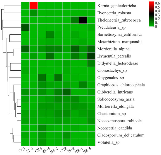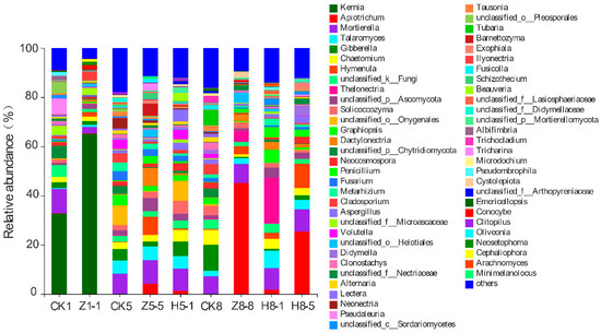 In addition to species with unknown classification (Figure 6), species with an average abundance greater than 1% included Mortierella alpina (4.39%), Kernia geniculotricha (3.48%), Gibberella intricans (2.99%), Hymenula cerealis (2.90%), and Thelonectria rubrococca (2.44%), for a total of six species. Compared with H8-1, the relative abundance of Hymenula cerealis and Didymella heteroderae of H8-5 increased by 290.25% and 1380.76%, respectively, and that of Thelonectria rubrococca of H8-5 decreased from 18.54% to 0%. The relative abundance of Barnettozyma californica in Z5-5 was the highest at 5.04%. Clitopilus sp., Psathyrella kellermanii, and Cystobasidium minuta were only present in H8-1 and H8-5 (Table S1).